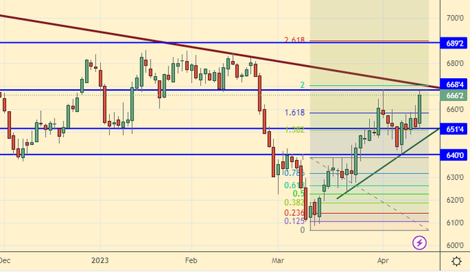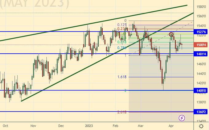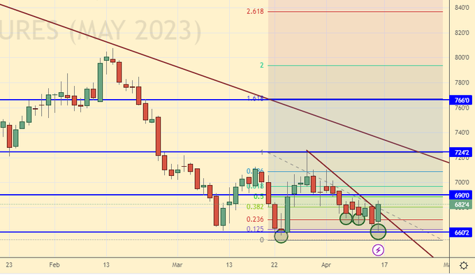 Сценарий роста: рассматриваем майский фьючерс, дата экспирации 12 мая. Был шанс купить от 640.0. Теперь рынок отправится к 690.0. Рост к более высоким отметкам пока не рассматриваем.
