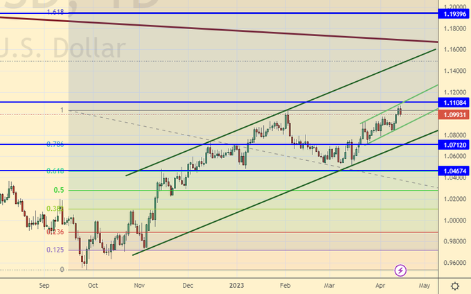 Сценарий роста: а мы взяли и прискакали на 1.1100, быстро пролетев 1.1025. Кто бы мог подумать. Держим лонги. Новых позиций не открываем.