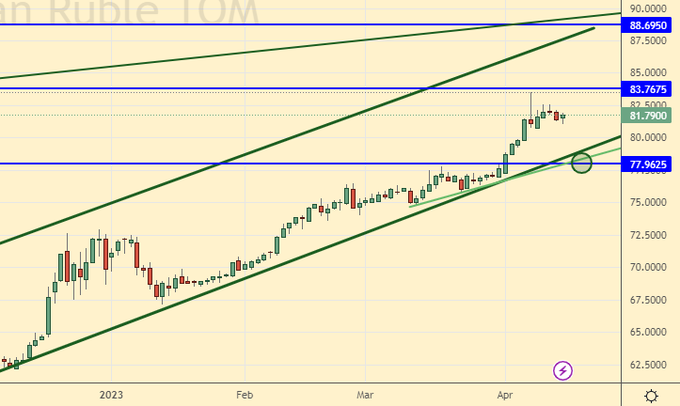 Рубль не хочет укрепляться. У быков по рублю есть еще пара дней для того, чтобы обозначить движение вниз к 78.00. Если его не будет, то стоит всерьез начать рассуждать о подъеме к 88.00. И уже после достижения отметки 88.00 будем рассчитывать на откат в район 82.00.