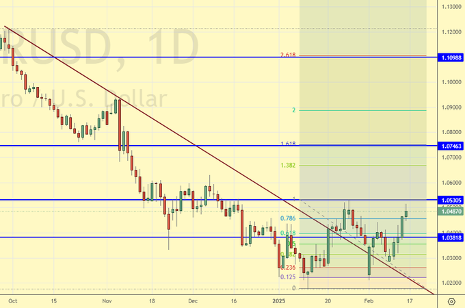 Сценарий роста: «доллар будет находиться под давлением из-за буйного поведения нового – старого президента США. Можно купить». Так мы писали на прошлой неделе. Пока да, пока за Евро то, что придется занимать (выпускать облигации) для производства оружия. Но этот оптимизм не на долго.