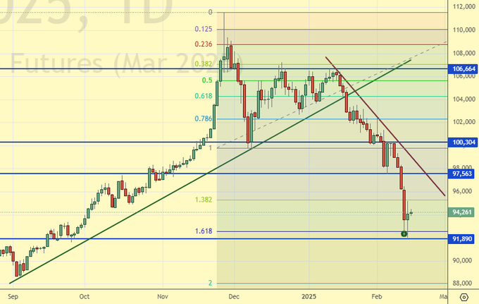 Сценарий роста: рассматриваем мартовский фьючерс, дата экспирации 20 марта. «Любой намек на завершение СВО укрепит рубль на 5 рублей в течение одного часа». Это почти было верным предположением. Мы ушли ниже, до 92000. Купим. Слова – это не дела.