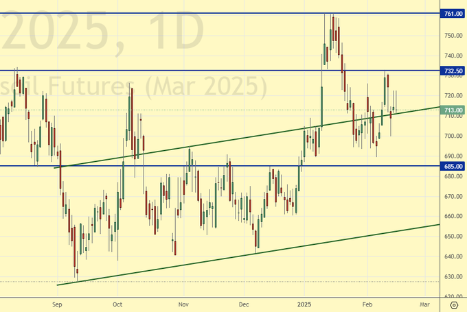 Сценарий роста: рассматриваем мартовский фьючерс, дата экспирации 12 марта. Для новых покупок нужен откат к 680.0. У кого есть лонги, держите.
