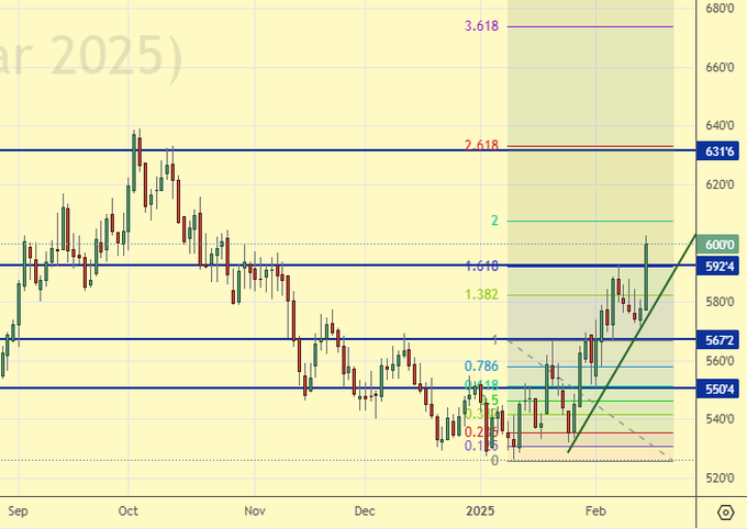 Сценарий роста: рассматриваем мартовский контракт, дата экспирации 14 марта. Будем держать лонг. Идем к 630.0, дальше не ясно.