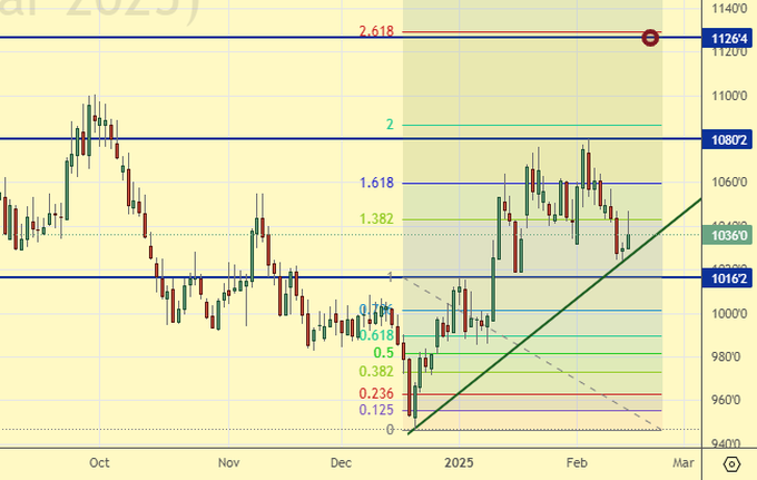 Сценарий роста: рассматриваем мартовский фьючерс, дата экспирации 14 марта. Можем дойти до 1125. Желающие могут купить на текущих отметках со стоп-ордером на 1010.0.