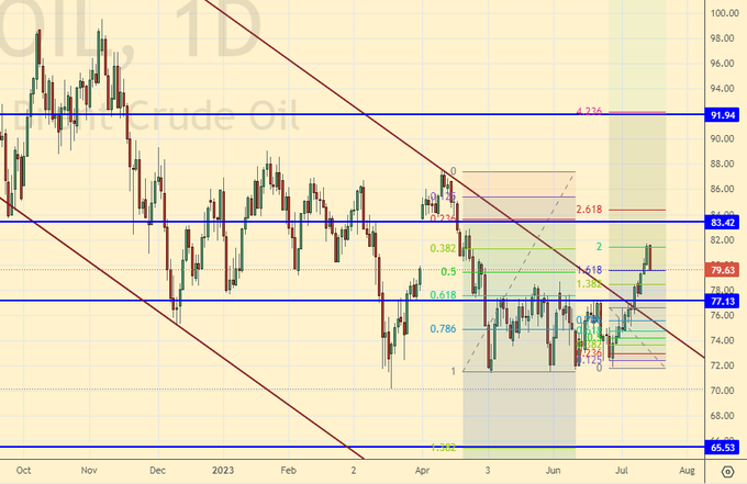 Толпе аналитиков очень хочется верить, что Китай оживет и к концу года будет и рост спроса на нефть, и акции компаний продолжат рост. Однако, вспоминаем про высокую ставку в США и про то, что она негативно действует на экономику с лагом 6 – 9 месяцев, и понимаем, что чуда не произойдет. Будем колебаться около нуля по итогам 23-го года. То есть никакого роста не будет, никаких 102 млн. баррелей в день потребления нефти в 4-м квартале. ОПЕК, если надо, снова сократит добычу.