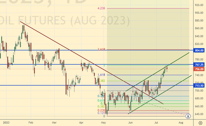 Сценарий роста: рассматриваем августовский фьючерс, дата экспирации 10 августа. Хочется увидеть рост к 800.0. Держим лонги, фиксируем часть прибыли, поджимаем стоп-ордера.