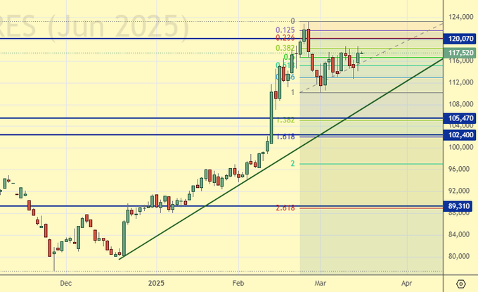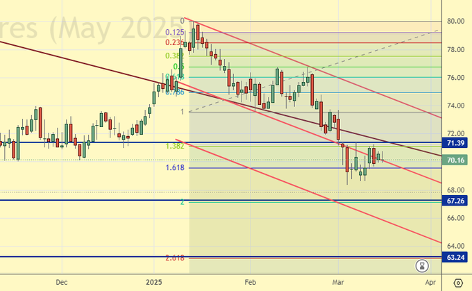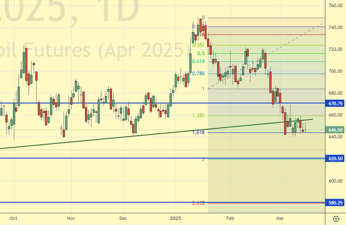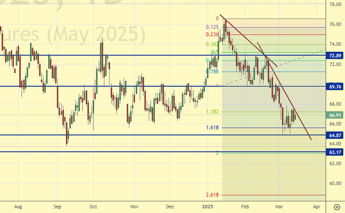 Продлены американские санкции против российского энергетического сектора. Это, в целом важное событие, прошло как-то тихо, за ширмочкой. Никакого ужаса, никакой паники на бирже. Лицензия L8 не продлена, что значительно усложняет покупку зарубежными компаниями энергоресурсов из России. Есть основания полагать, что Трамп в случае отказа России от перемирия на Украине введет еще более жесткие санкции против экспорта российской нефти и газа. На этом фоне рынок нефти пытается продемонстрировать живучесть, но структурно он смотрится тяжелым и не будет ничего удивительного, что мы через пару недель ляжем на отметку 60.00, будут санкции или нет.