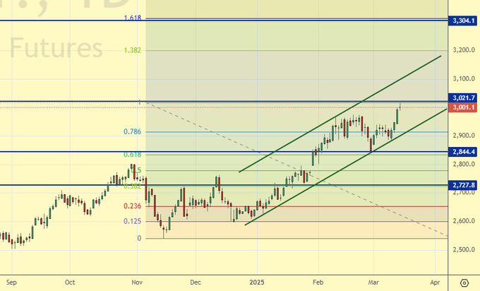 Сценарий роста: рассматриваем апрельский фьючерс, дата экспирации 27 марта. Откатили, но нам бы хотелось получить 3.100 для нового лонга.