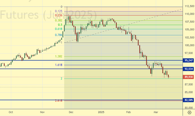 Сценарий падения: пропустить ход к 82500 не имеем права. Однако! Мы на уровне 2.000 по Фибоначчи, что может привести к возврату к 100000. Кто не в позиции, отрабатывайте ход вниз на часовках.