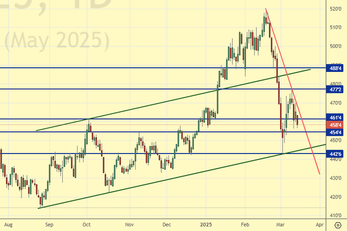 Сценарий роста: рассматриваем майский контракт, дата экспирации 14 мая. Интрига. А если все-таки 500.0 будет. На текущих уровнях не покупаем.