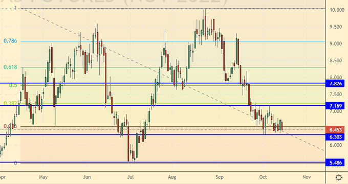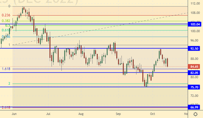 Мир разделился на две половины. Западу и иным потребителям нужны дешевые ресурсы. России и иным экспортерам нужны высокие цены. На рынке нефти идет жесткая подковерная борьба. До выборов в США остается меньше месяца. Байдену и компании надо рисовать красивую картинку. Нельзя исключать, что её помогают создавать и американские хедж-фонды, вот только у арабов денег столько, что куры не клюют. Битва между ОПЕК+ и администрацией Байдена продолжается. В данный момент рынок по Brent не виден ниже 90.00 долларов за баррель.