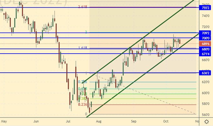Покупка: нет. Кто в позиции от 680.0, перенесите стоп на 670.0. Цель: 750.0 центов за бушель.