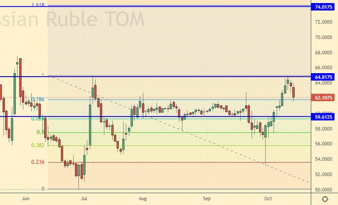 Сценарий падения: не отрицаем, что возможны сюрпризы, и рубль на тонком рынке может окрепнуть до 55.00. Но если гигантский профицит во внешней торговле не повлиял на курс рубля к доллару в сентябре, то почему укрепление должно произойти сейчас, когда ясно, что Россия к концу года сократит прибыль от продажи ресурсов на фоне санкций? Входить в лонг по рублю против доллара не будем.