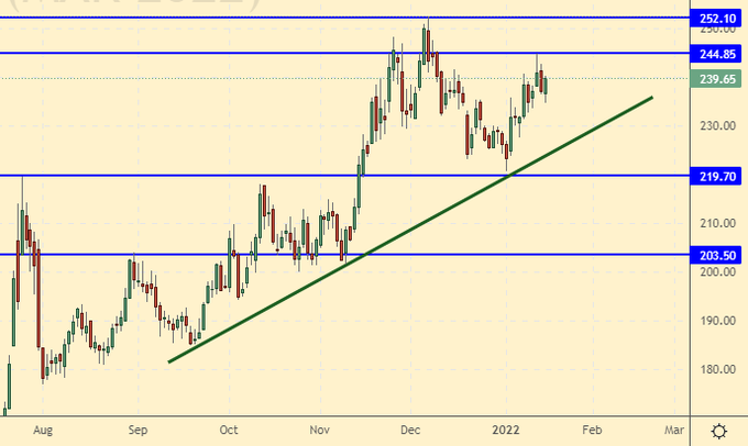 Сценарий роста: рассматриваем февральский фьючерс, дата экспирации 27 января. Мы рекомендовали покупать в районе 3.700, теперь просто держим лонг. В США были морозы под -30 по Цельсию.