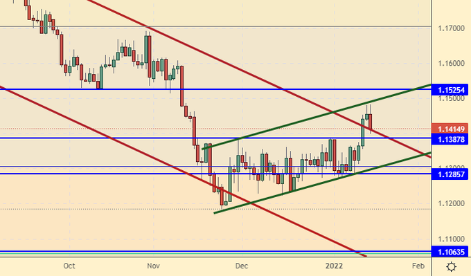 Сценарий падения: для продажи долларов нужны позитивные сигналы по рублю. Мы же ждем публичный отказ со стороны Вашингтона от требований Москвы отодвинуть военные базы от границ и прекратить расширение НАТО. А, кроме того, Минфин продолжит скупать доллары с рынка. Так что позитива у нас нет. А раз так, то нет и рекомендаций продавать доллар.