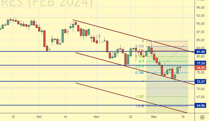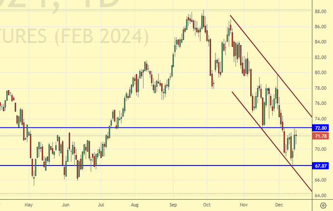 Сценарий роста: рассматриваем февральский фьючерс, дата экспирации 22 января. Ничего нового, как и раньше мы вернемся к рассуждениям о лонгах после роста выше 75.00. От 61.50 покупать обязательно.