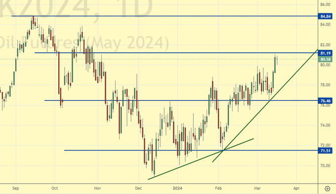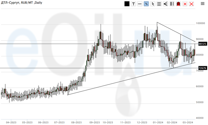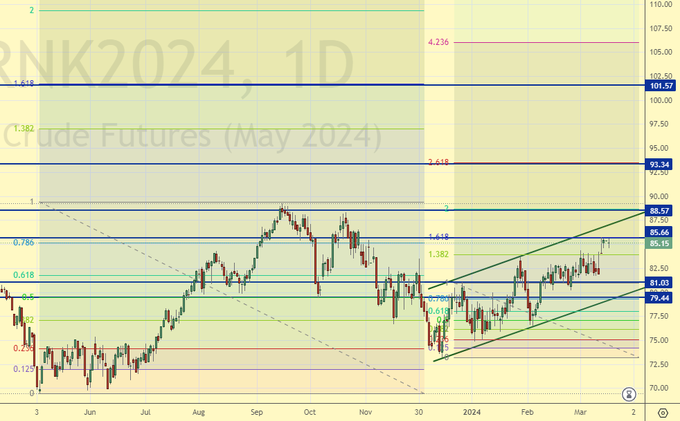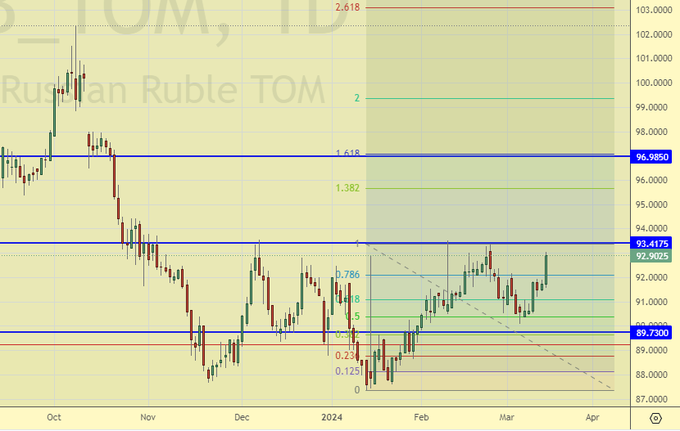 Сценарий роста: рассматриваем майский фьючерс, дата экспирации 22 апреля. Держим покупки, рассчитываем на ход к 90.00.