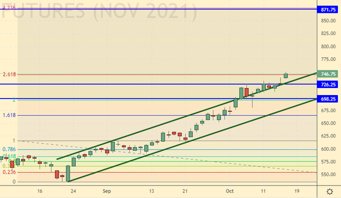 Сценарий роста: рассматриваем ноябрьский фьючерс, дата экспирации 12 ноября. Вероятнее всего соя достигнет уровня 1100.0. Не покупаем.