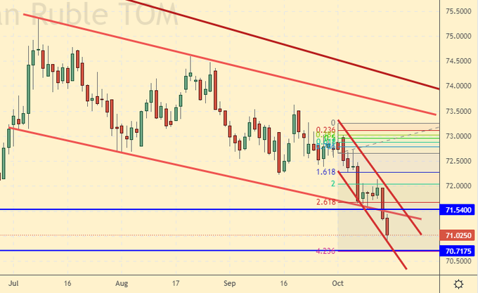 Сценарий падения: будем продолжать держать открытый восемь недель назад шорт от 73.90. Новых позиций на продажу не открываем. Скорее всего на следующей неделе мы достигнем цели на 70.80.