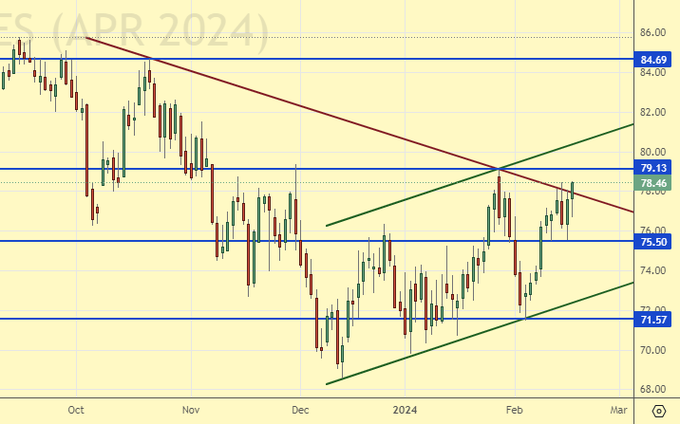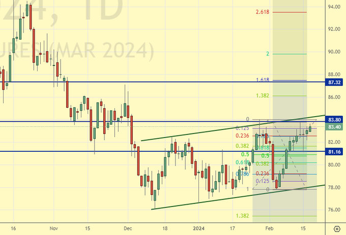 Сценарий роста: рассматриваем февральский фьючерс, дата экспирации 29 февраля. Рост выше 85.00 станет сюрпризом. Пока он не произошел, вверх не смотрим.