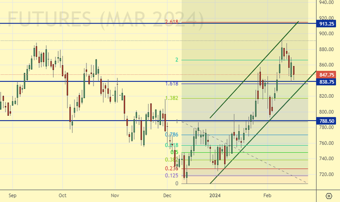 Сценарий роста: рассматриваем мартовский фьючерс, дата экспирации 12 марта. Нельзя исключать хода к 913.00. Купим.