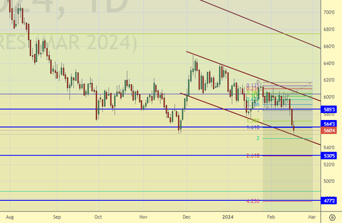 Сценарий падения: кукуруза, как это предполагалось ранее, утащила рынок вниз. При возврате к 585.0 можно продать.