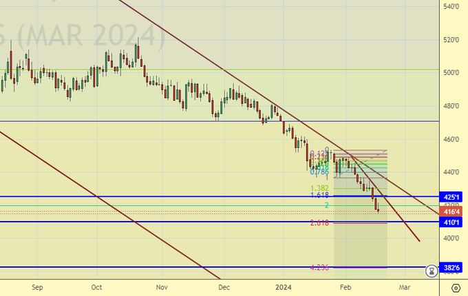 Сценарий роста: рассматриваем мартовский фьючерс, дата экспирации 14 марта. Интересно было бы купить от 382.0, но придем ли мы к этой отметке не ясно. Поэтому, покупать будем от 410.0, а затем уже и от 382.00.