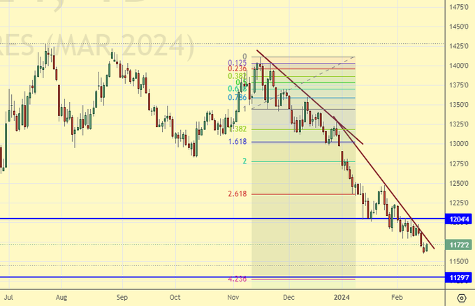Сценарий роста: рассматриваем мартовский фьючерс, дата экспирации 14 марта. Соя способна упасть к 1130. При подходе к данному уровню возможны покупки.