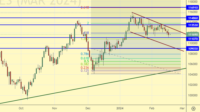 Сценарий роста: рассматриваем мартовский фьючерс, дата экспирации 21 марта. Пока мы ниже 115000 рассуждать о покупках не будем. Вне рынка.
