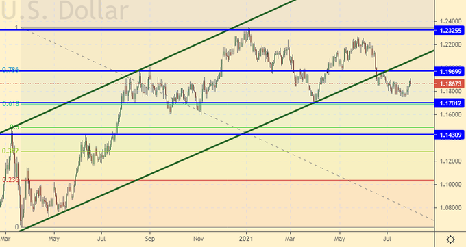 Сценарий роста: евро фундаментально слаб, но доллар еще слабее. Народ в начале года ждал, что вот-вот и политика низких ставок в США подойдет к концу. Но Пауэлл требует, чтобы все потомственные тунеядцы нашли себе работу и только после этого ставки будут повышены. Это игра. Причем её цель ослабление давления на платежи по государственному долгу за счет искусственной инфляции. Рост доллара, как минимум, пока откладывается. Можно купить.