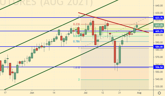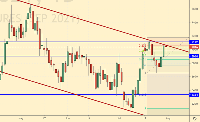 Сценарий роста: рассматриваем сентябрьский фьючерс, дата экспирации 14 сентября. Ситуация напряженная. Если ценам удастся вырасти выше района 715.0, то мы можем получить ход к 750.0.