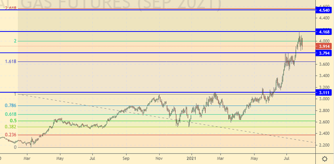 Сценарий роста: рассматриваем сентябрьский фьючерс, дата экспирации 27 августа. Европейская волна роста цен на газ дошла и до США. Скорее всего мы увидим касание 4.500. А вот дальнейшее восхождение под вопросом.