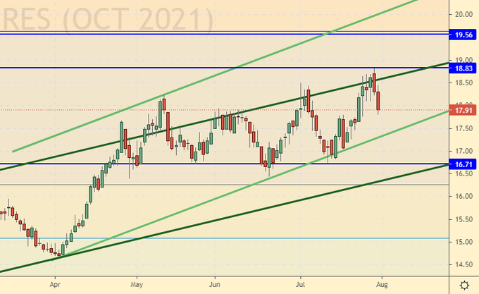 Сценарий роста: рассматриваем октябрьский фьючерс, дата экспирации 30 сентября. Неприятное падение в четверг и пятницу. Тем не менее, продолжим держать лонг с целями на 19.50. Стоп-ордер пододвигаем ближе к месту событий.