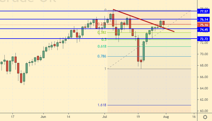 Сценарий падения: так как наш стоп на 76.30 уцелел, оставим шорт. Желающие могут продать на текущих уровнях. В случае падения ниже 73.00 можно добавить.