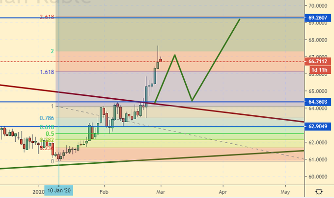 Сценарий роста: рубль смотрится плохо. В случае отката к 64.50 покупать обязательно. Позитива будет в этом году для рубля мало. Никто не удивится ход у к 69.00. Для того чтобы пройти еще выше потребуется плохой новостной фон.