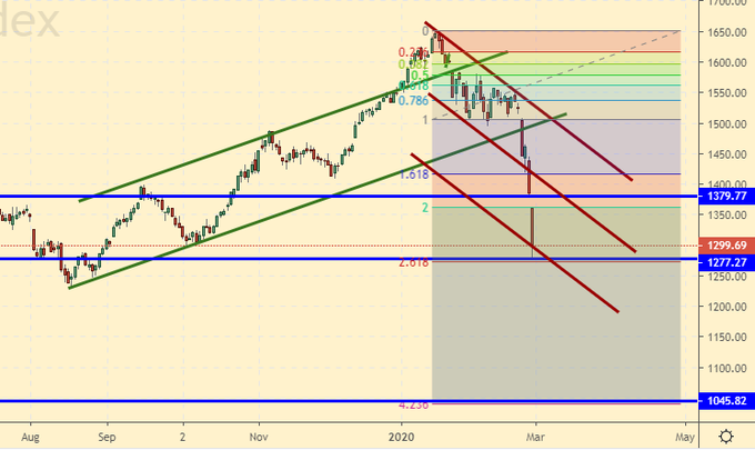 Сценарий падения: откат в район 1380 можно использовать для продаж на «часовках». Откат к 1450 на «дневках». Если рынок продолжит падение в понедельник, ищите возможности на «часовках», пока цены будут находиться ниже 1250. В случае их роста выше данного уровня, всякий раз уходите из шортов. Цель: 1050.