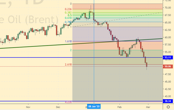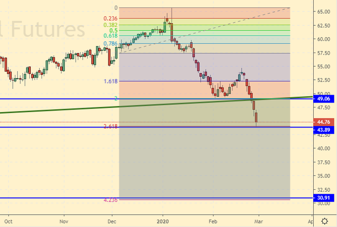 Сценарий роста: рассматриваем майский фьючерс, дата экспирации 31 марта. Если мы в понедельник не нарисуем зеленую свечу, то падение продолжится вплоть до конца четверга. Далее, заседание ОПЕК, и слабая надежда на лучшее. Явно покупать можно будет только когда мы окажемся в районе 40.00! Возможную коррекцию к 55.00 с текущих уровней лучше отрабатывать на «часовках».