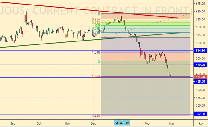 Сценарий падения: кто осторожно вошел со стопом на 526.0 и забрал цель на 442.0 – наши сердечные поздравления. Что делать теперь? Ждем отката в район 500.0 и продаем снова. Чтобы ОПЕК не согласовал, падение потребления топлива из-за эпидемии будет огромным в этом сезоне.