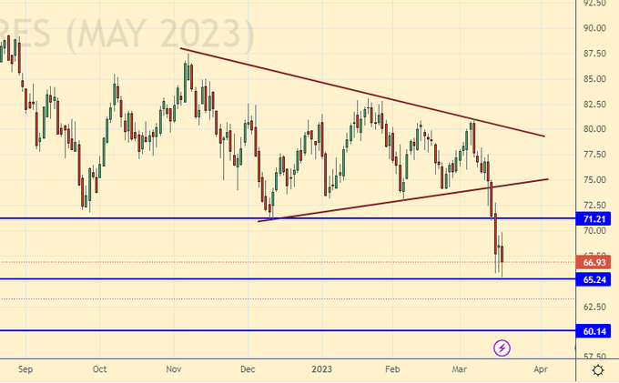 Сценарий падения: упали ниже 74.00. Идем быстро. Нельзя исключать прилета к 60.00. Отметим, что первая наша отметка на 66.00 рынком была достигнута.