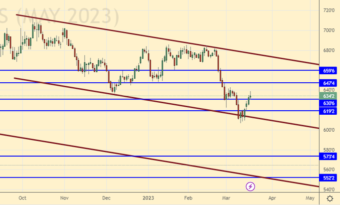 Сценарий роста: рассматриваем майский фьючерс, дата экспирации 12 мая. Мы продолжаем неохотно восстанавливаться после падения в феврале. Рынок способен пройти к 770.0 до майского заседания USDA. Держим лонги.