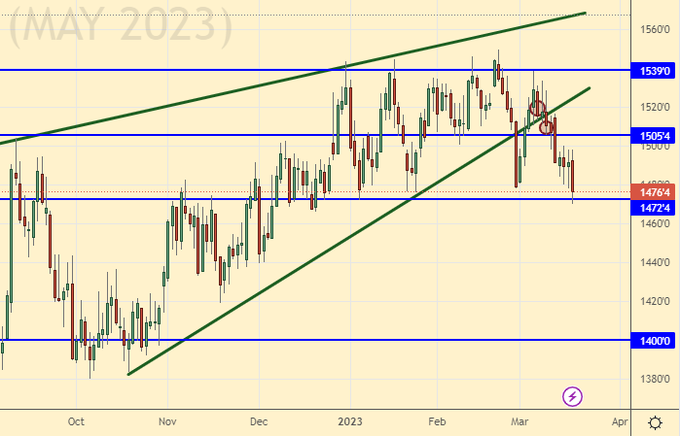 Продажа: нет. Кто в позиции от 1540.0 и 1530.0 перенесите стоп на 1520.0. Цель: 1400.0 (1000.0) центов за бушель.