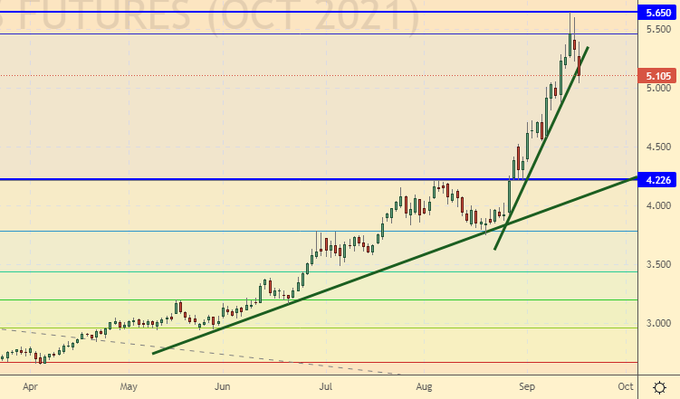 Сценарий роста: рассматриваем октябрьский фьючерс, дата экспирации 28 сентября. Рынок достиг нашей цели на 5.40. Если будет откат к 4.20 можно купить снова. Ситуация с газом в Европе будет тяжелой весь отопительный сезон.