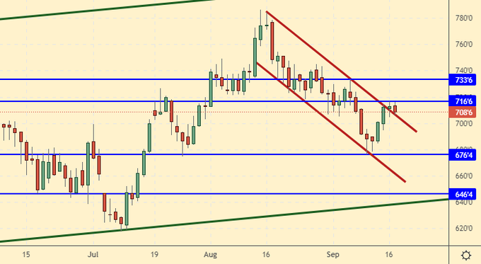 Сценарий роста: рассматриваем декабрьский фьючерс, дата экспирации 14 декабря. В случае закрытия дня выше 715.0 будем покупать.