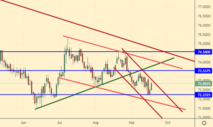 Сценарий падения: будем продолжать держать открытый месяц назад шорт от 73.90. Усиление политики ФРС в ближайшем будущем под вопросом.