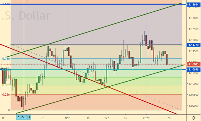Сценарий роста: формально мы продолжаем оставаться в растущем канале. Надо держать лонги. 23-го числа заседание ЕЦБ. Если Лагард снова выдаст крайне мягкий комментарий по итогам заседания, то доллар может начать движение к паритету. Падение ниже 1.1050 откроет путь к 1.0555.