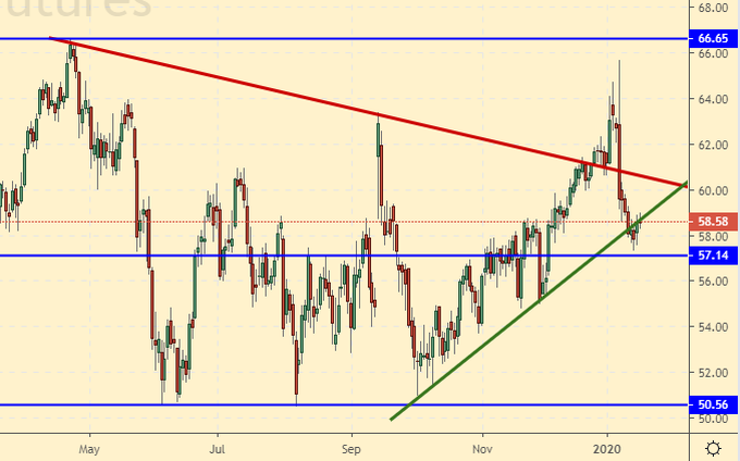 Первая часть соглашения между США и Китаем подписана. Что имеем: Китай обязуется увеличить закупки энергоносителей в США на 52 млрд. долларов за следующие два года. Оригинал соглашения можно просмотреть или скачать здесь, обратите внимание на страницу (6-3). Рынки энергоносителей относительно спокойно отнеслись к данному событию. Продолжаем отмечать, что история с данными переговорами утомила трейдеров и реакция на новость была сглаженной.
