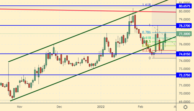 Поддержка – 74.81. Сопротивление – 78.27.