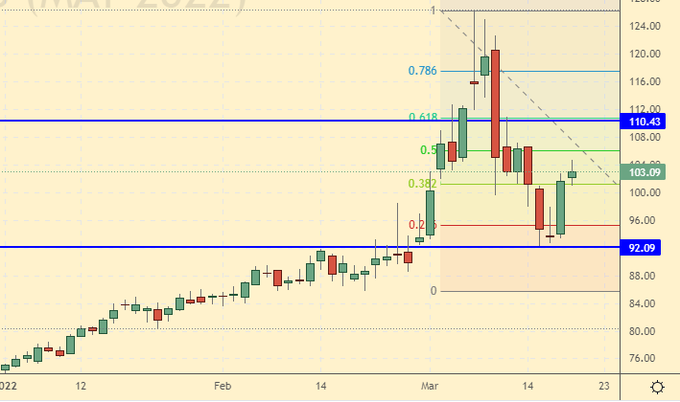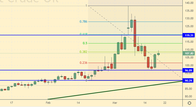 Сценарий роста: рассматриваем мартовский фьючерс, дата экспирации 31 марта. Стоит проявить некоторое упрямство и не отказываться от покупок на данном этапе. Ход на 120.00 возможен.