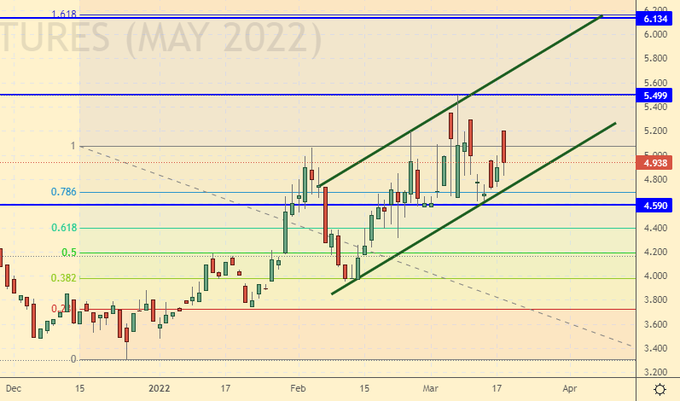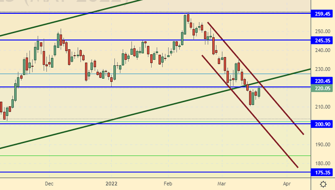 Сценарий роста: рассматриваем майский фьючерс, дата экспирации 27 апреля. Продолжаем держать лонги. Всем страшно. Если Европа начнет запрещать экспорт в Россию лекарств, семян и других чувствительных позиций, Миллер торжественно закроет кран.