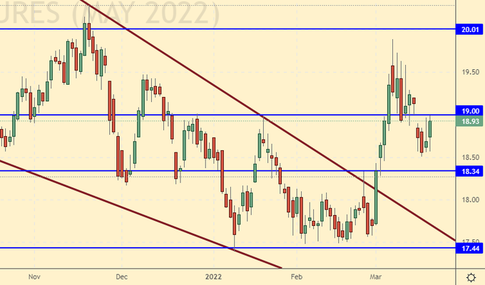 Сценарий роста: рассматриваем майский фьючерс, дата экспирации 29 апреля. Продолжим держать бычью позицию. Явно будут проблемы с урожаем с сахарной свеклой на Украине.